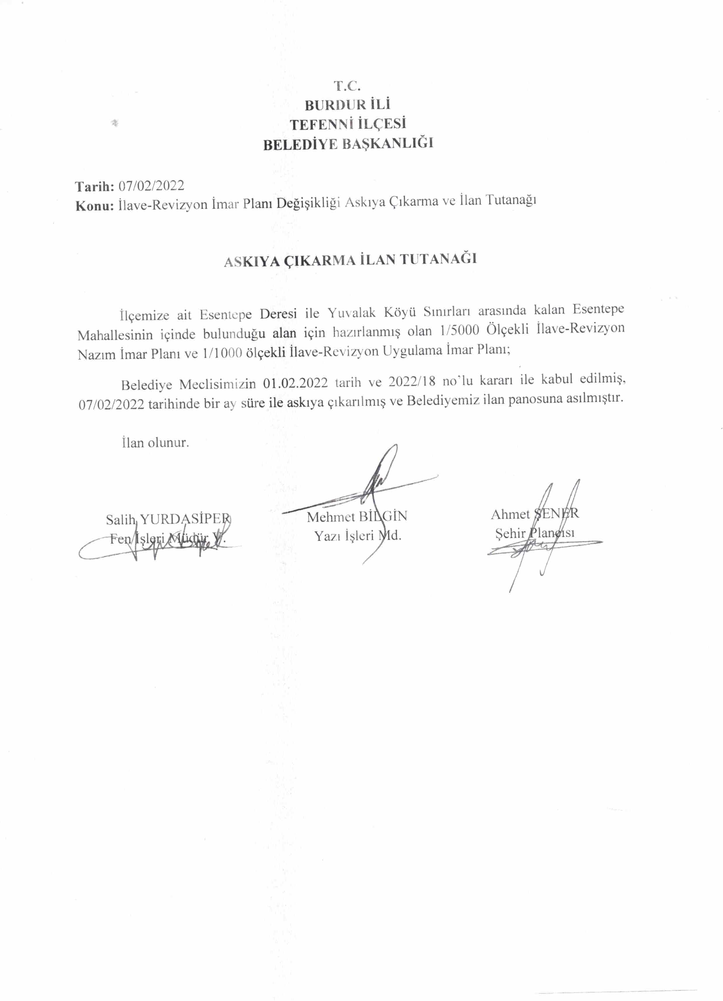 İLAVE-REVİZYON İMAR PLANI DEĞİŞİKLİĞİ ASKIYA ÇIKARMA VE İLAN TUTANAĞI